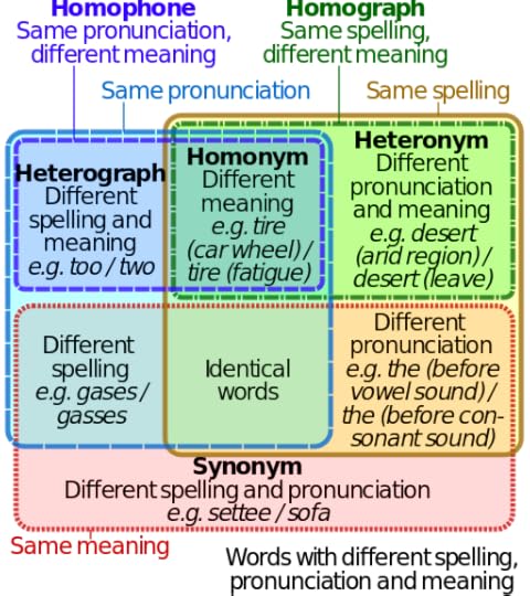 Diagram from wikipedia by Will HeltsleyHere is an interesting diagram I found today on wikipedia while researching what the correct term was for two words which are spelled differently but sound the same and have completely different meanings. The word I wanted was homophone.