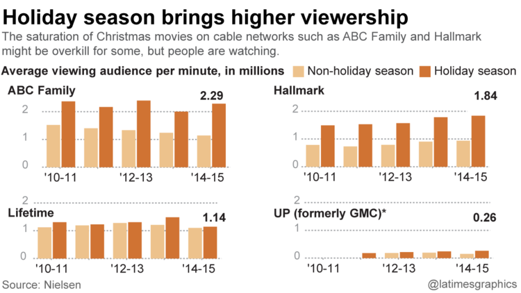 But the surge of holiday programming is more apparent on cable, where networks such as Hallmark, Lifetime, ABC Family and the small channel UP can dedicate weeks, or months, of programming to the genre.