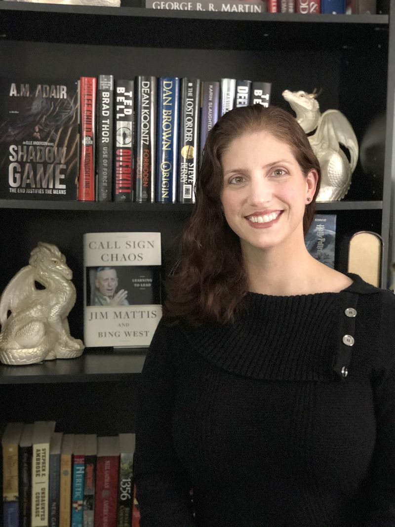 After years of considering a novel, Adair typed the first chapters of “Shadow Game” on her laptop during downtime on a 2016 deployment in Italy. A self-described introvert, she found the solo pursuit a perfect fit.