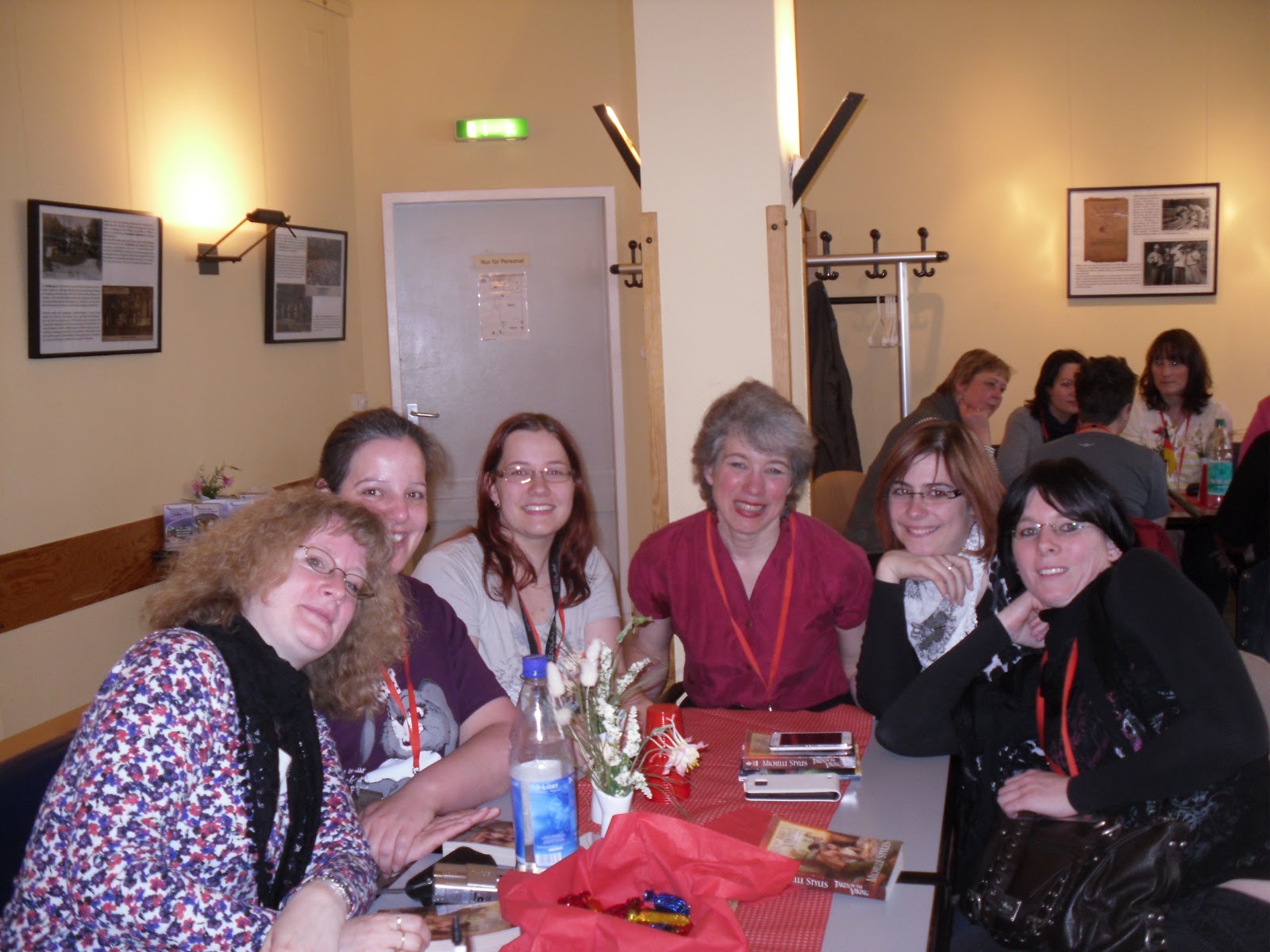 At Saturday morning breakfast, I encountered a very lovely German translator. She does the translations for Sherry Thomas, Courtney Milan and a number of other historical authors. It was really interesting to hear how she tries to get the word play right etc.I then walked to the conference centre and encountered my friends from realms on Our Booksheleves. they have done reviews of my books in the past and I was so pleased to finally meet all of them in person. They are so much fun. After chatting with them, I went straight to work. First up a historical panel with Maya Banks and Lara Adrian. Sandy Schwab whom I've known online for years did the moderating as she speaks both German and English. We spoke about how we individually approach doing research. Both Maya and Lara only write medieval whereas I write in a number of time periods. The hall was packed. I also met a Cora editor (Bettina) whom I seen at breakfast who was very nice.