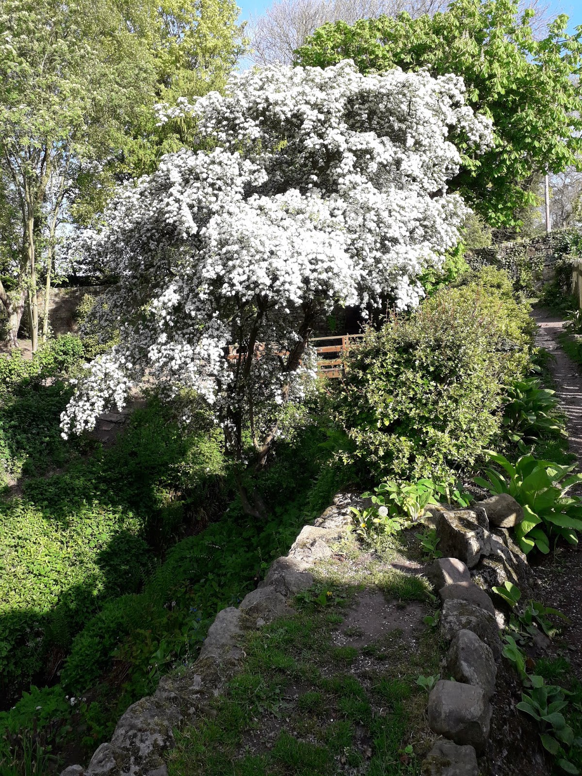on the house side of the deneThe stream is connected to an old farm pond which sometimes the farmer neglects. It used to run the gin-gan. One year, we had the firemen back out pumping the pond as a sheep had died and blocked it. Had the Victorian earthworks gone, the entire village would have been threatened. The stream also serves as a storm overflow. Sometimes the farmers do discharges and this results in incidents. But no pesticides have been used for years as far as I can figure. We uncovered paths and found bits of the garden that we had not quite realised existed that first winter. Sometimes it was obvious that certain things were once a specific garden but trees had grown far too big. The conifer by the greenhouse was a case in point but a huge focal point from the village. That is until 2013 when a storm hit and blew it into the greenhouse. The sweet chestnut now has room to grow.There are loads of levels to this garden – it is in a small wooded valley and therefore pathways and parapets. Many of the walls have ivy growing up. And as I suffer from ecological tidiness disorder, I have a tendency to cut the ivy every so often so that it stays on the walls, doesn’t swamp plants and we can see the garden. We do it in the winter so that the birds are not nesting, and it does return. However, I suspect this has to change and beating myself up over the past is not going to help matters. There is a balance to be struck and I suspect I have gone too far on the side of human tidiness rather than benign neglect. It is going to have to be something I work on – not tidying things up too much. And I can’t beat myself up too much. It is just things are going to have to change but I had to physically stop myself pulling ivy out of the wall by the cars this morning.