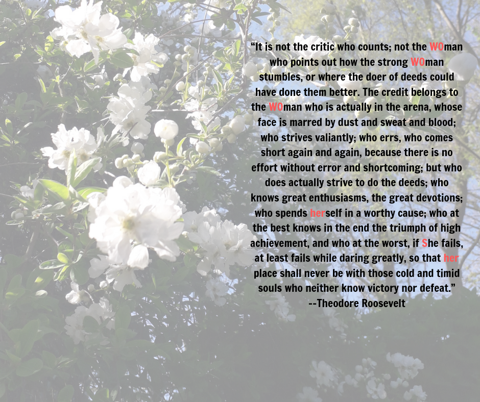 I have various strategies including keeping a scrapbook of good reviews (because you do forget) but I saw this quote today. It was originally in the masculine and I am sure Teddy Roosevelt meant it to encompass all people but I found it more pertinent and forceful to change it to the feminine.