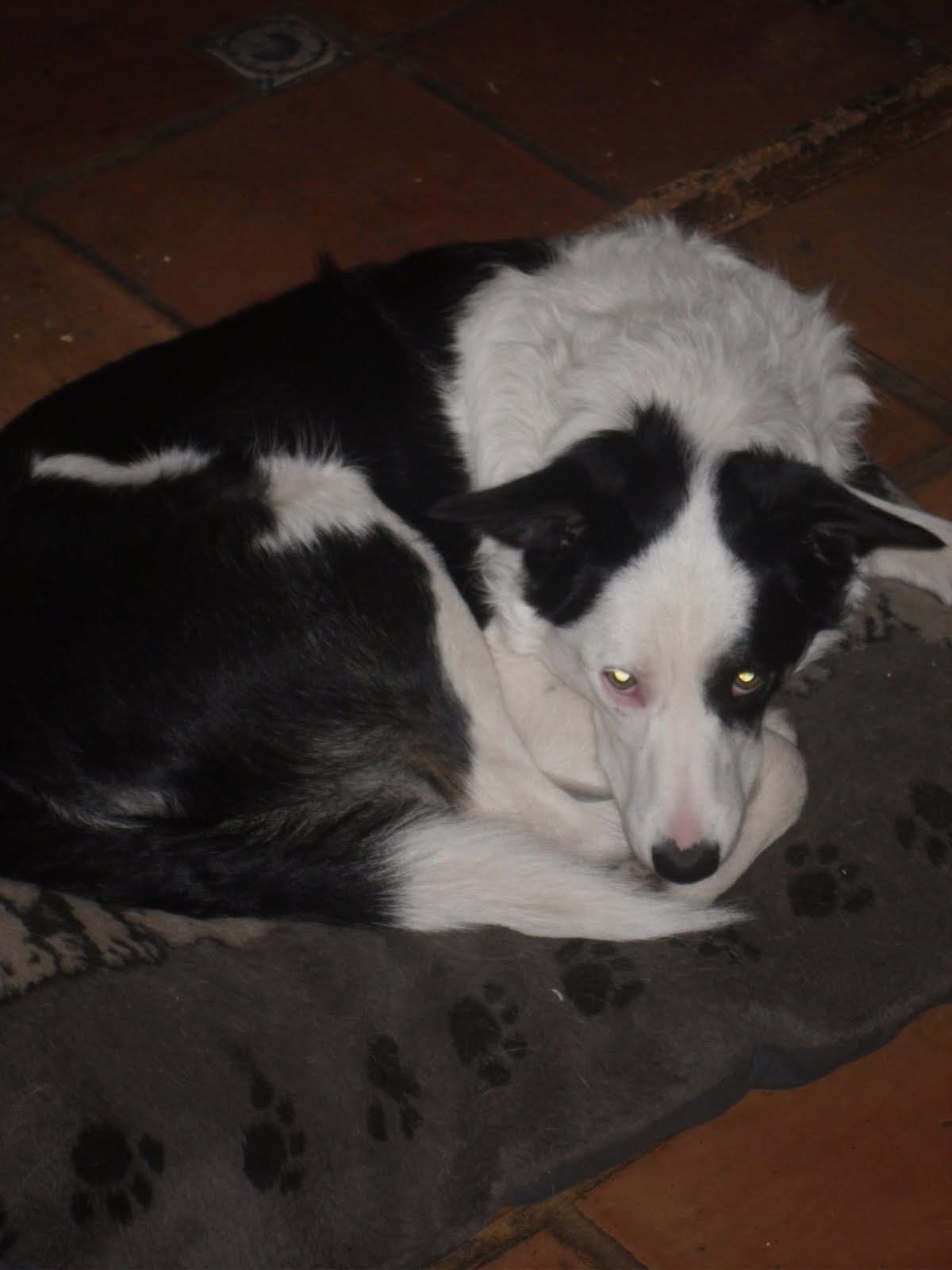 Tess has managed to sprain her elbow. She started hobbling about and had to visit the vet. Tess decided that the vet who actually is the Border Collie loving vet was in fact the Devil Incarnate and attempted to hide underneath the chairs in the waiting room. After extracting her, she deigned to have her leg looked at. The vet explained she'd jumped wrong and would have to be kept quiet for a few days. A common occurance apparently. She has nothing in her paw. He gave her an injection. Tess then decided she had had enough and attempted to bolt of the vet's office, nearly tripping a cat carrying lady in the process.Tess does not do quiet. She does life at double speed. Her greatest love is a game of fetch, preferably one which involves leaping. It is going to be a long few days...