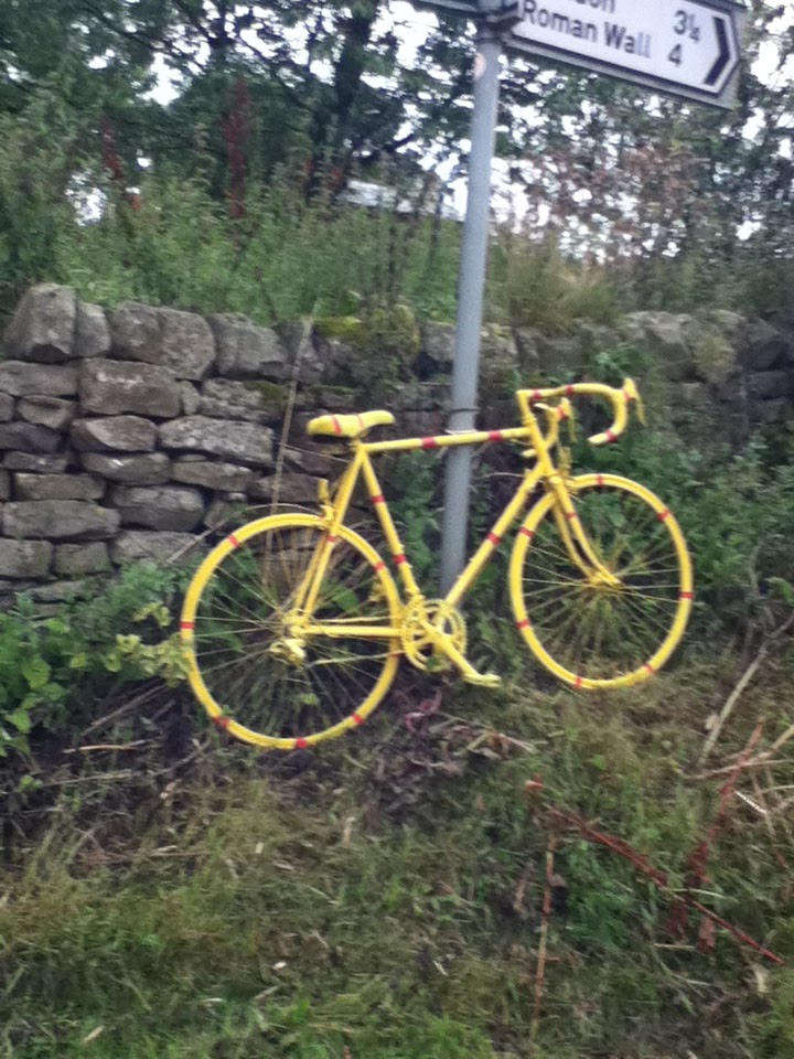 All around the village -- red and yellow painted bicycles have appeared. At first it was a bit disconcerting, particularly the one at the entrance to the village, chained to a signpost. But it rapidly all became clear -- it is in celebration of the Aviva Tour of Britain which is passing through the village on 10 September. The red and gold are the colours of the Northumberland flag.