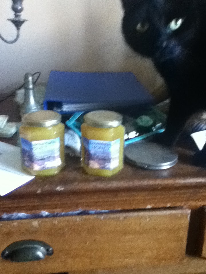 Heathcliff inspects the jars of honeyOther than bottling a couple of bottles for my youngest son to take back to uni with him, I am just waiting for the honey to drip through.