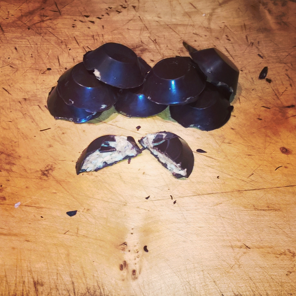 I discovered these the other day and they are very simple to make.This is my versionI used a silicon canape tray for the mould. You could use little muffin cases. Whatever you use, you want it small and easy to remove.Put the silicon tray into freeze. Melt 200 grams of 85% dark chocolate. Take tray out of freezer and coat the bottom and sides of each mould with chocolate. Put tray back in freezer for a few minutes. You will now have a tray of chocolate cups. Take out and put a teaspoon of no added sugar peanut butter in each chocolate cup (you could make your own -- grind unsalted peanuts with a little oil and a pinch of salt until smooth or use any nut butter – I had organic peanut butter to hand). Smooth the tops so it sits slightly below the chocolate. Spoon chocolate over the top of the peanut butter to seal. Place back in the freezer for about 10 minutes. Remove from tray. Store in the fridge.Because it is dark chocolate and no added sugar peanut butter, they are actually somewhat healthy.Makes about a dozen.
