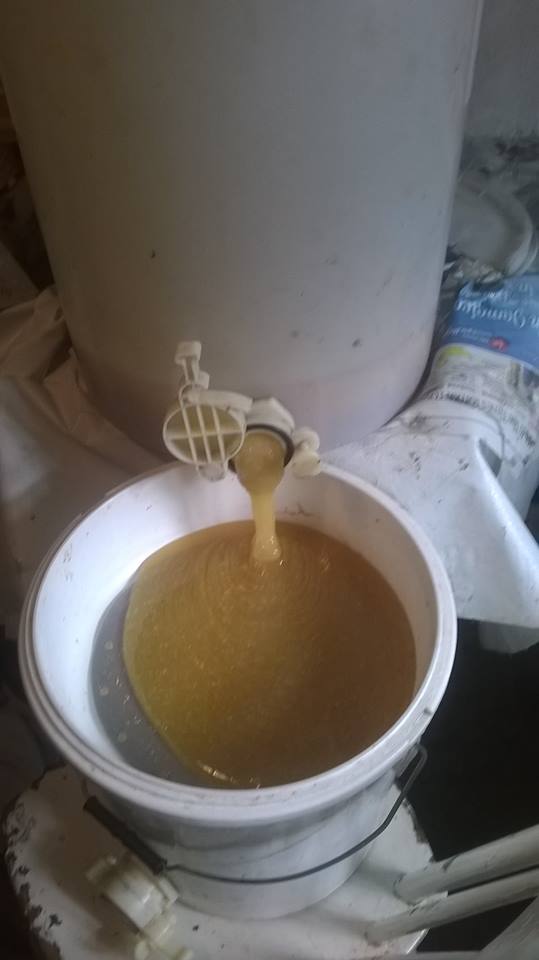 After being extracted, the honey gets filtered to get rid of the wax/dead bees etc. I also put the cappings in and allow them to drain.