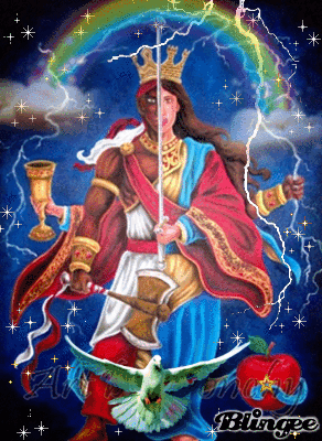 Chango. Here he carries an ax. Below is Saint Barbara. Can you see the resemblance? They both carry sharp objects and wear red. They also both like lightening and thunder.