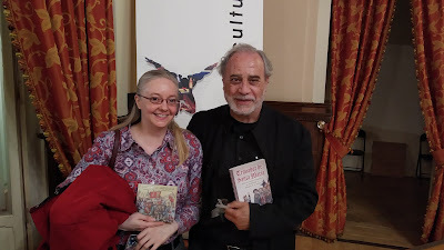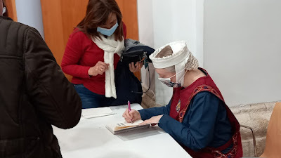 Luckily, Eduardo then asked me what I write. I accepted Trovador de Santa Maria from Mario, and showing it to Eduardo, I explained that it's a book I wrote for the 800th anniversary, and that the short stories are based on the plots of cantigas. And that I would be honored if he accepted this copy. He was incredibly gracious, insisting I sign it and gifting me a triple-disc set in return. (So I'm seven discs richer in cantigas than before I went to Ciudad Real!)