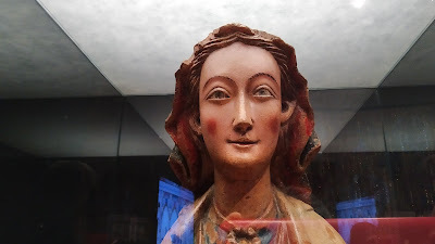 After a wonderful visit, I've been reading about the Romanesque art of the cathedral of Santiago de Compostela. Maestro Mateo, the designer, was kind enough to sculpt a near-life-size statue of Santiago the pilgrims could approach and wrap their arms around. In this way, they tangibly experienced the object of a devotion so strong, they left their homes and walked for months in its honor.