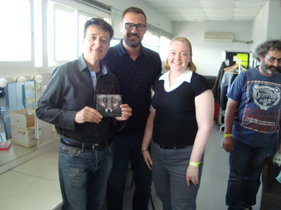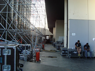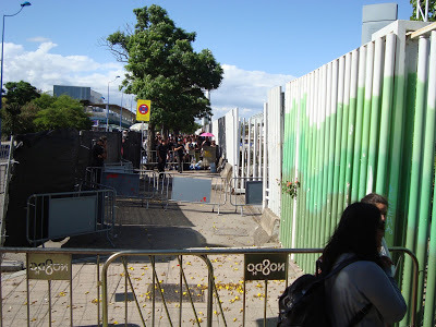 We chatted and waited patiently while the wind buffeted us. Some guards came out and gave us bottles of water and little posters advertising the concert in Badajoz, in June, much too late for us. A certified groupie arrived and acted as if she was on the special guest list. She wore a white t-shirt elaborately printed in black with “Mira Manolo lo que tengo pa’ ti solo” (Manolo, look what I have just for you). Yowza! I told Stanley what it meant and we both had the impression that nothing like that would move him. A friend of hers wearing the same shirt stopped by but didn’t stay, showing us that there’s more than one person who not only thinks of Manolo as a sex object, but also thinks he might cast his sexuality toward his fans. The idea didn't belong on the Planet Manolo we'd experienced.