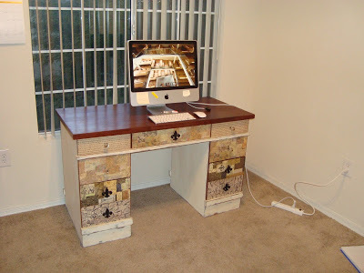 It's in better condition than the one I sold in Massachusetts to my unexpectedly sore regret. It has all the storage I was looking for and plenty of space without being so large we couldn't expect the delivery men to bring it up the stairs. It's eclectic. I think it's unique. I've never seen another desk with world maps and steamer trunk stamps on the drawer faces! There are also inspiring words on the top left and right drawers. A Francophile must have designed it, with the Eiffel Towers and the fleurs-de-lis, but I can forgive that, as an enlightened Hispanophile. I walked away from that antique mall with a deep knowing that I'd (my husband had) found what I was looking for.