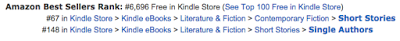 During the free days, Unpredictable Worlds hovered around 113 in the Short Stories category most of the time. The number felt meant to be, containing as it does my husband's and my most romantic number, and I was happy with it, but if pressed, I would admit that I'd hoped to make it into the top 100 in at least one category.