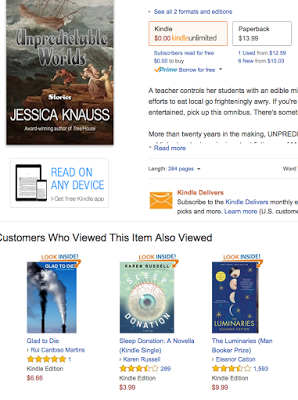 After I made a Facebook plea (though I can't be sure that caused it), Unpredictable Worlds attained its highest rank on Monday at 9:44 pm: #67 in Short Stories!