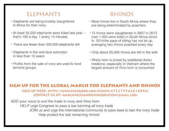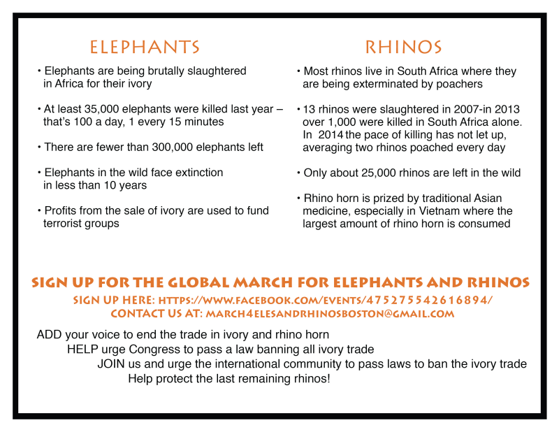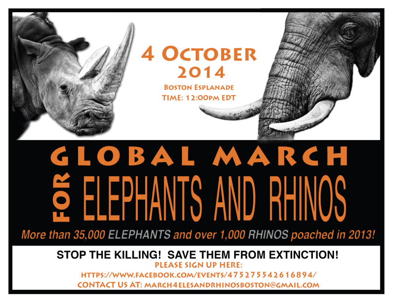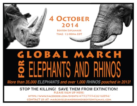 The Global March for Elephants and Rhinos takes place October 4. Find out where the march is taking place near you and how to sign up. The postcards in this blog post have information for the one nearest me, Boston, Massachusetts.