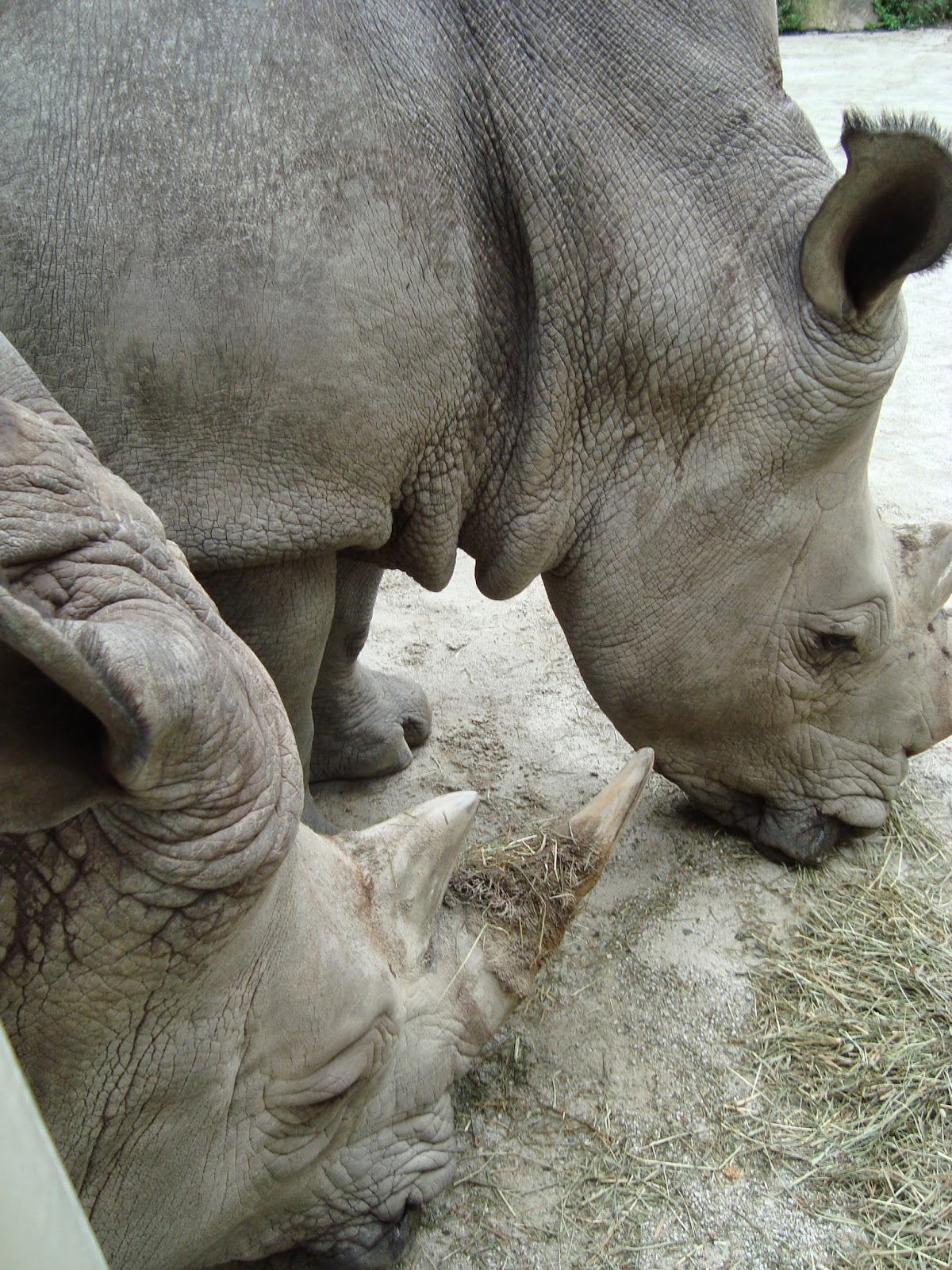 They have strong neck muscles to hold up those big heads! White rhinos have a unique way of eating. With no front teeth, they suck the food back with their wide lips and grind it with their molars. Near the end, Betsy put the hay out for Thelma and Louise to eat and we got to listen to them slurping and enjoying their meal for a while.