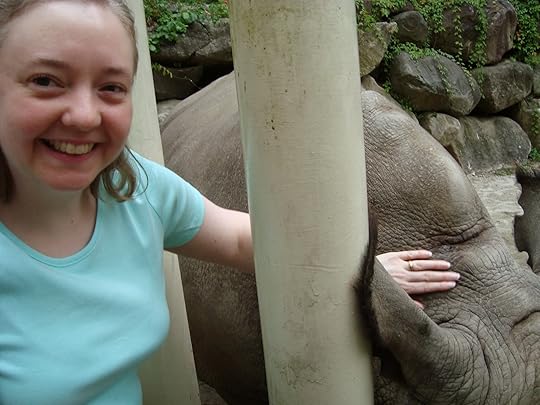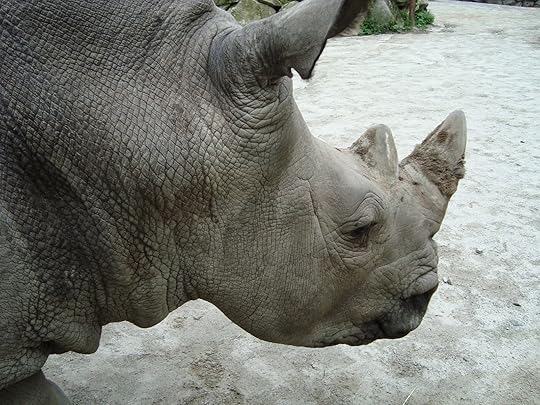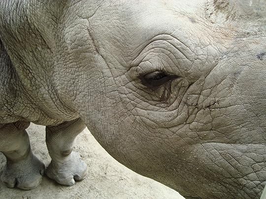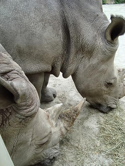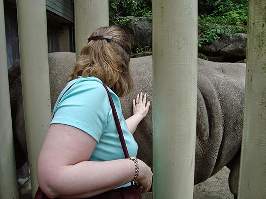 When my wonderful husband saw that a certain amazing zoo in our area was doing "rhino encounters," in which the visitor "gets up close and personal" with two beautiful, healthy, good tempered white rhinos, he did the right thing and scheduled it for us. We saved up our money, because a life-changing experience like this isn't cheap. That's okay, because half the money goes toward upkeep and half toward International Rhino Foundation programs. We weren't sure what "up close and personal" really meant, but we dared to hope that we could touch them. My husband and I have seen many YouTube videos that confirm the idea that most rhinos love to be petted and scratched, but were sure the zoo would only allow it if it was okay with these particular rhinos (and the insurance companies!).