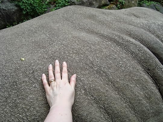 What does a rhino feel like? Good. Here, on the back, the skin is inches thick and a little bit rough. We were told we could slap them pretty hard back there because they don't feel it otherwise, but I'm sure I was too gentle. It seemed too disrespectful to hit them!