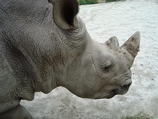The horns are compacted strands of keratin (a biomatter found in most mammals, and in human hair and fingernails). Rhinos like to rub their horns on rocks to shape them, and Thelma had been sharpening hers to a nice point. The rubbing is why you can see hairlike strands puffing out around the middle in these pictures. The horns don't feel like anything special. Touching the horn, you might never know there was such a wonderful creature attached to it. I emphasize: a rhino's horn is of no use to anyone but a rhino.