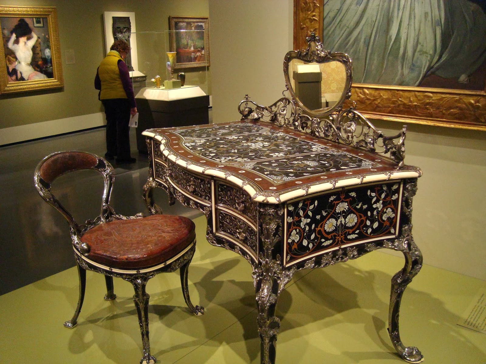 Keeping with the reading/writing theme, this women's writing desk knocked me out. In the background of the picture you can see some famous Bostonian Gilded Age paintings, but this desk kept me spellbound because I could vividly imagine using it. It was made to impress, with pounds of silver and other precious materials, for the World's Fair in 1893. As I picture using it to write, of course, the first thing that come to mind is whether I would be too distracted with how I looked to really write. Did they put those mirrors on ladies' writing desks to keep their minds where they should be, on the shallow things? Or is it intended to reflect light and save eyesight?