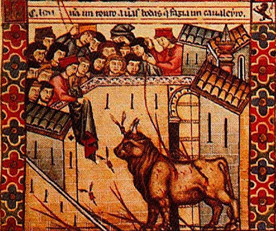 She hardly had time to ask, “When does it start?” before the last downstairs door was barred and the beast lumbered into the plaza ahead of a couple of boys waving sticks and shouting as they herded it. They dropped the sticks and helped several other men close the fourth timber stack as if it were a door, and the bull was isolated. His black mass heaved mighty breaths and his horns looked so sharp they almost cut the air while he tossed his head and pawed at the ground. Doña Lambra looked deep into his eyes. “Oh, Justa, oh, Álvar! Have you ever seen such an enormous bull?”