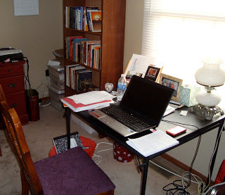 It's a cheap card table we bought in Tucson when we had no furniture and no money, but on it rests everything I needed: a window to cast natural light on the subject; a chair I upholstered with my dad and needs already to be re-upholstered; an old lamp from my grandmother, who passed away in 2002; a picture of my critique group, who believes in me; a phone to get calls from my husband, who also believes in me; the book with the original texts upon which I based my novel; a chapter outline; a picture of the place where Margaret Mitchell wrote about half of Gone with the Wind; a bottle of water; a heart-shaped frame with a picture of Alfonso X el Sabio, my hero and the one who had the surviving texts written down; and to the right, left, and behind the laptop (no internet connection) as well as on the floor in a bag leaning on the table leg, notes. Some wonderful books about the middle ages inhabit the shelves you can see in the picture, and you can't see the music that I had playing, various instrumental pieces from as close to the tenth century as I could find. I had a pretty similar setup in Georgia with a gorgeous tree-filled view, but I started the novel in Tucson with the laptop literally in my lap and only some of the notes to guide me. It's been a long, strange trip.