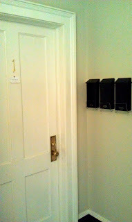 Here is the door they used to get in and out, complete with mailboxes. There was a back door through the kitchenette. Margaret was a reporter for the local paper, but when she broke her ankle, she became housebound. When her husband got tired of ferrying books back and forth from the library, he told Margaret she'd read every book they had, and she should write her own.