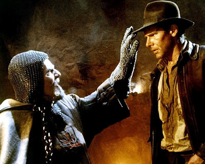 This last time I watched that portion of the movie, and the Grail Knight was waving goodbye to Indy and his dad before they rode off into the sunset, my sympathy stayed with the knight and I imagined what he must be thinking. It's along the lines of, "What a bunch of jerks. They come here, convert a guy into a pile of ash, steal the holy grail, utterly destroy the place by trying to take the grail outside the boundary, throw the grail down a deep dark hole, and then just leave me here to clean it all up!" Is he supposed to keep living there in that mess? Do his grail guardian duties extend to having to go into the hole and to retrieve it? Or is it so far beyond the boundary that he can't reach for it without dying? So many questions.