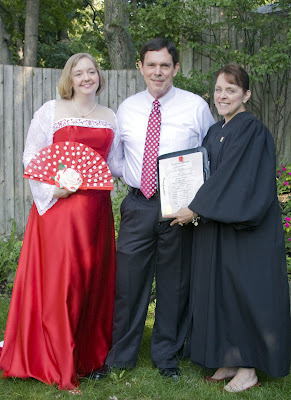 Here's a picture from that effervescent day with the officiant, Carol Merletti, who, I might add, has made the Best of Boston list every year since she married us. Hooray!