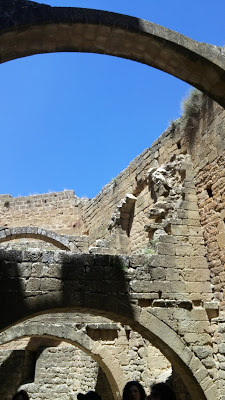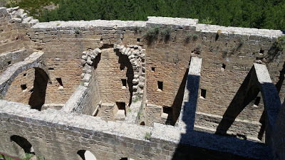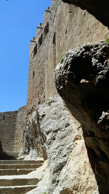 The outer wall was not built by the original architects, but it still combines usefulness and beauty. Created in the thirteenth century, it defended the castle and the town around it. They didn't have to build the wall all the way around because the rocks, the original and ultimate defense, were already there, and will continue there long after the castle falls into ruin. The town moved down the hill in the sixteenth century, and people took many stones from the wall to build new houses.