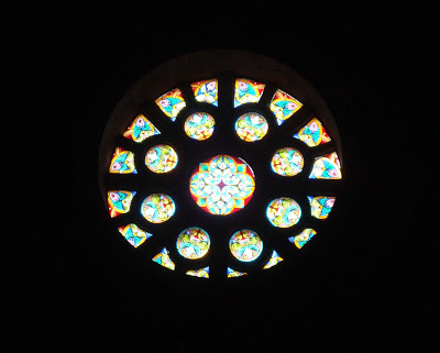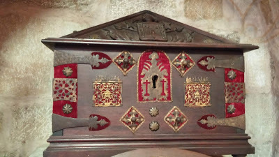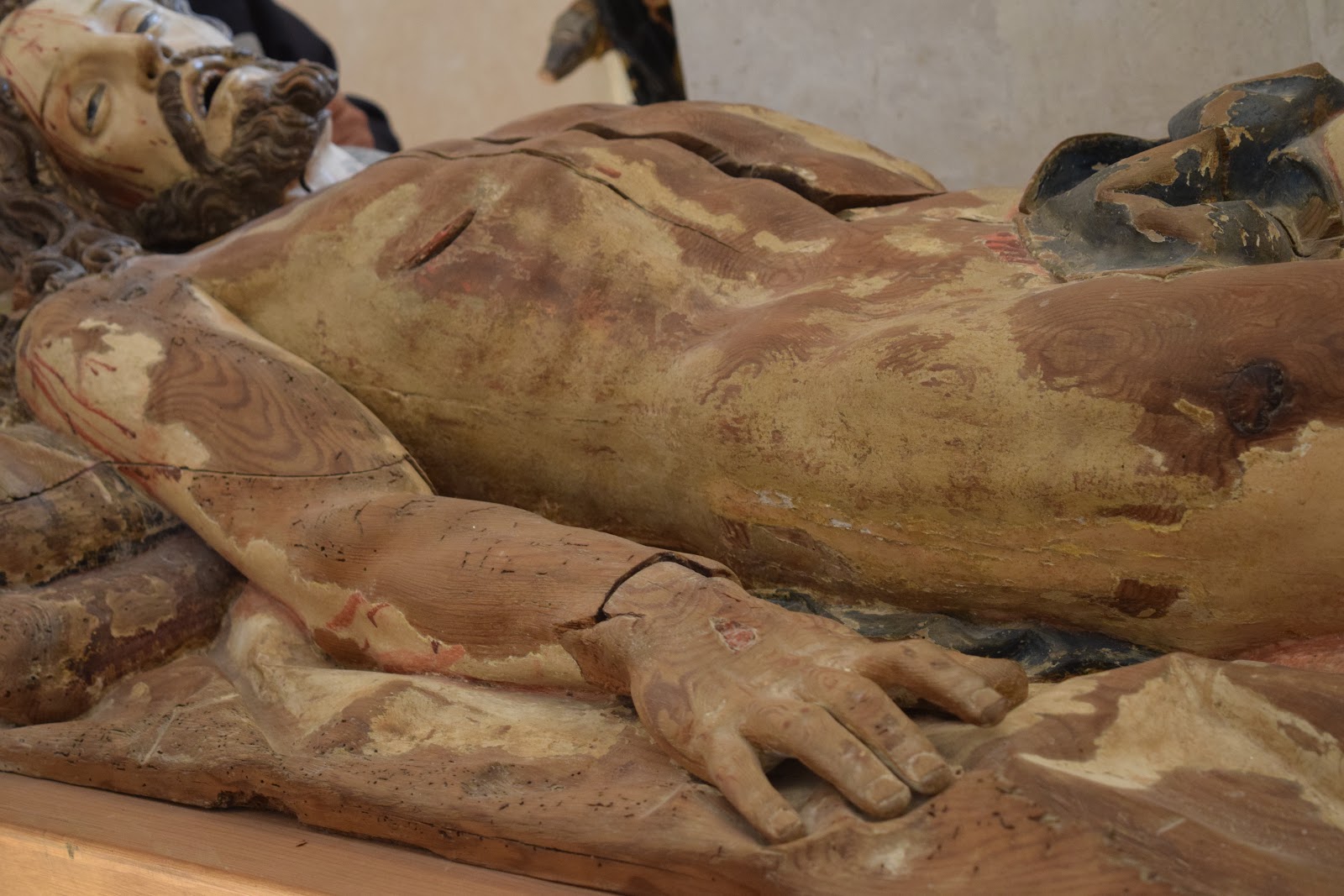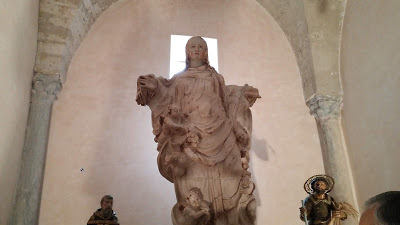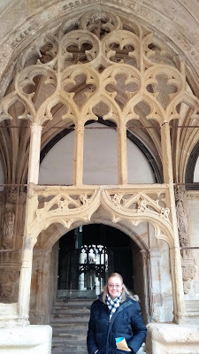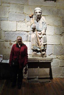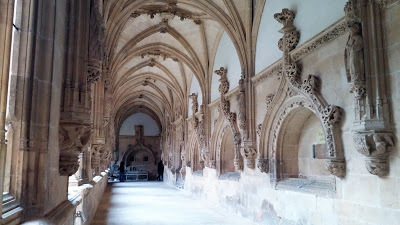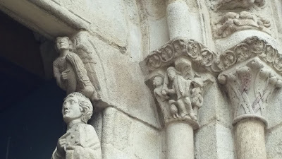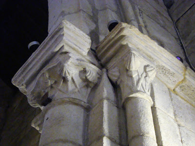 erected in the fourteenth century. The statuettes are portraits of the royals buried inside. Tigridia became a saint during her time here as abbess. We admired a Baroque altar with her casket, then a recently revealed lineal Gothic mural depicting the entire life of St. Mary the Egyptian, a stunning Romanesque-Gothic transition Crucifixion surrounded by a gorgeous Flemish-Spanish fifteenth-century altar, and two Romanesque capitals up so high I couldn't tell what they represented, complete with original paint. I won't complain anymore about high-up Romanesque capitals because I'm taking a course in Romanesque symbolism. Now I know that height was just as important to Romanesque artists for looking up toward God as it was for Gothic artists. They just went about it in diametrically different ways.