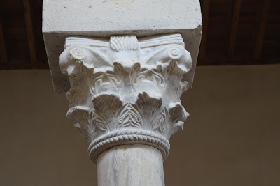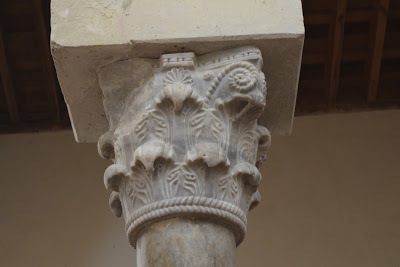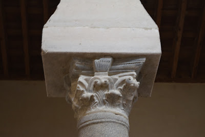 This bracket is doubly wonderful because there was room at the top for a little medieval humility bragging. The letters translate to "Humble Flammola offers this modest gift to God." This gives credence to the "Flammola" reading of the exterior frieze. Many scholars believe this signature is from the ninth or tenth century, which puts me on Seven Noble Knights alert. The name "Flammola" had morphed into "Lambra" by the thirteenth century, when the seven noble knights' legend was first written down. Lambra, the name of the villainess of Seven Noble Knights ! As unusual at it seems today, this name was common in the early Middle Ages, so the Flammola/Lambra who founded or restored this extraordinary church was probably not also the scourge of the heroes in my book. In spite of how close this temple is to Salas and Barbadillo, where the bloody cucumber incident set everything in motion...
