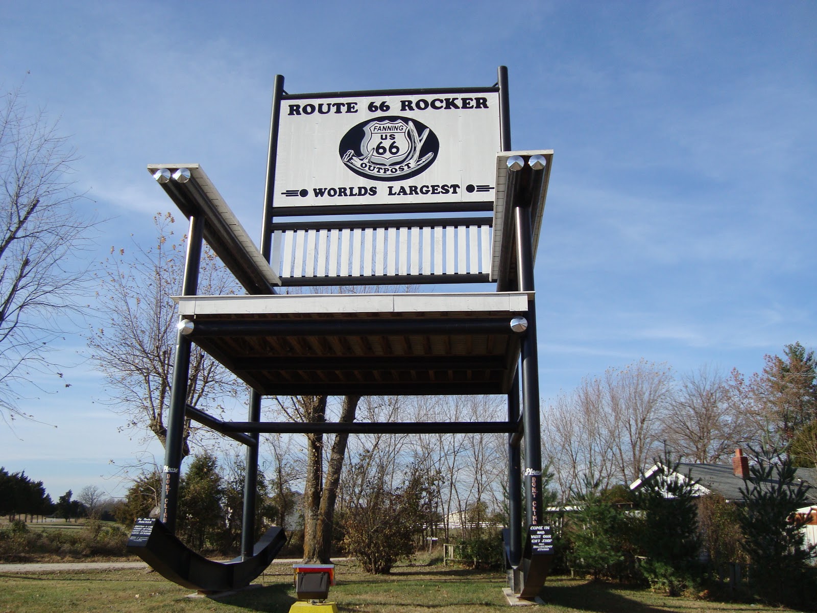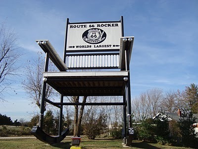 Notice the warning sign on each front leg.Certified by Guiness, I have no doubt, the photo shows the World's Largest Rocking Chair. We passed by this amazing piece of welding in Missouri on our way from Pennsylvania to Arizona. It actually took a couple of tries for us to find it. I guess we weren't expecting it to be right there in the open, because we saw the sign on the chairback, and drove right by, not registering that it was the actual rocking chair until we swung back around.