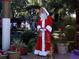 Pere Noel in Epcot CenterBarbara: My home is an older-style farmhouse minus the backstairs and pantry. Because my disabled son lives with me, I've turned one particular room into both my area and his. My desk is my favorite piece of furniture in the house. Aged, solidly built, it has a dignity earned over the years. Its drawers are deep. One even has wooden files built into it. The top is wide -- so wide that it easily accommodates my computer, my printer, all my notebooks and reference material, and there's still plenty of room left for my coffee mug and oodles of sharpened pencils. Having this personal zone with everything I need at hand makes it a comfortable place to sit down and write. Nearby is my art desk, full of markers and colored pencils. It sits next to one of the two windows overlooking the backfields and barn. Birdfeeders are everywhere as are poplar and maple trees. In the center of that room is my son's table on which he puts puzzles together. Next to his table is his recliner sitting near that other window. The room is painted a warm, pale yellow. Sunrises are breathtaking. Actually, "morning" is my favorite word, for it offers hope and a new beginning -- a gift of another day. Watching the world wake up yet again is empowering. Seeing the sky turn from black to hints of daylight inspiring.