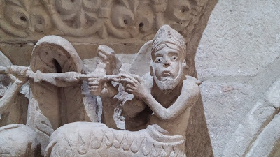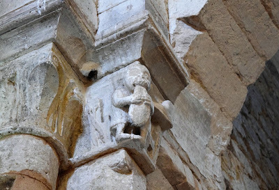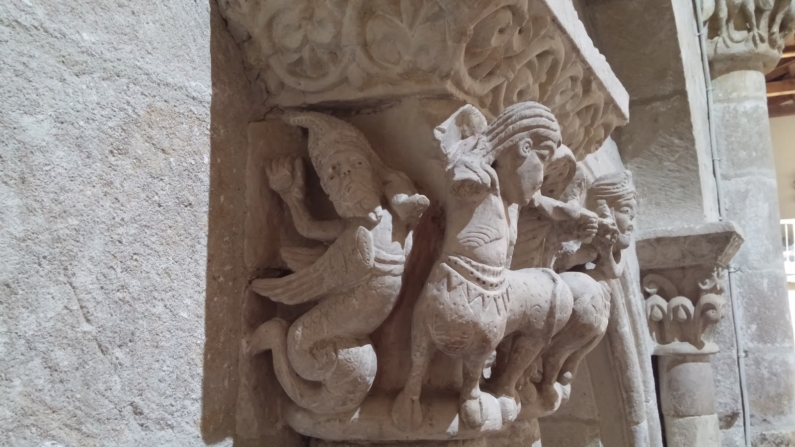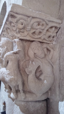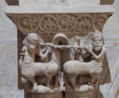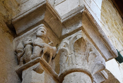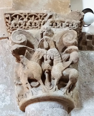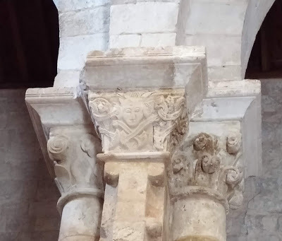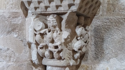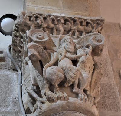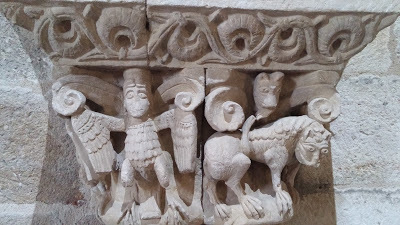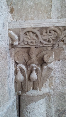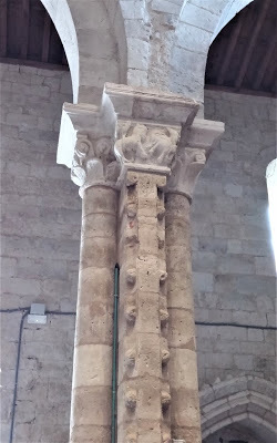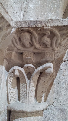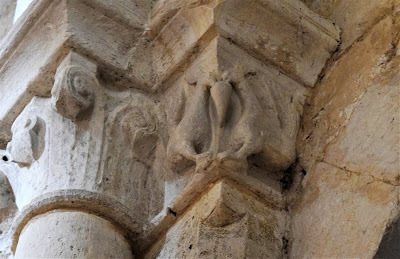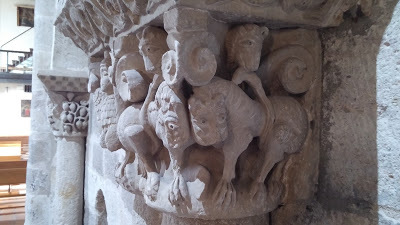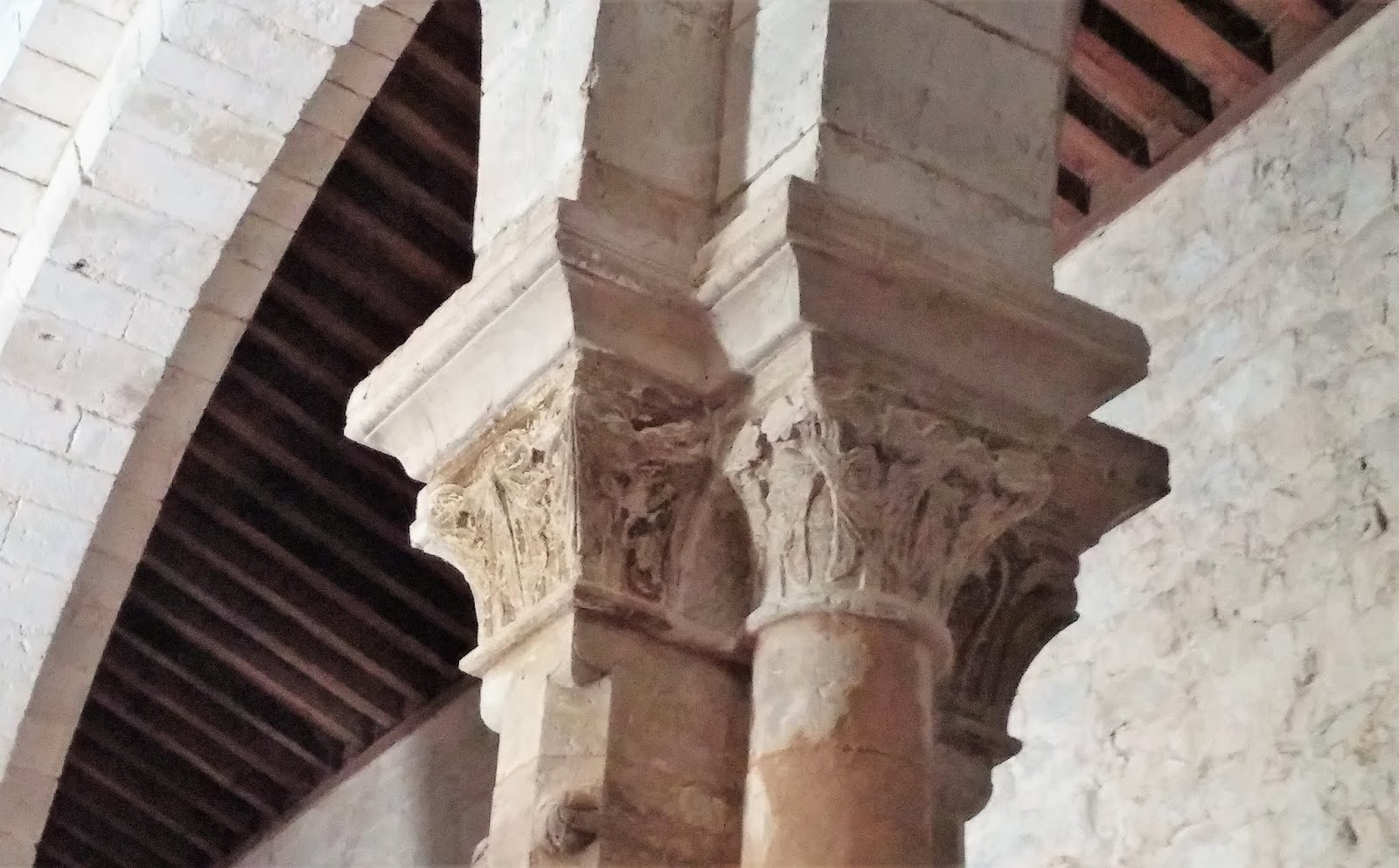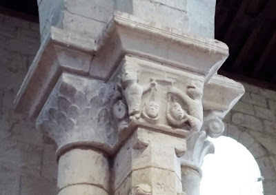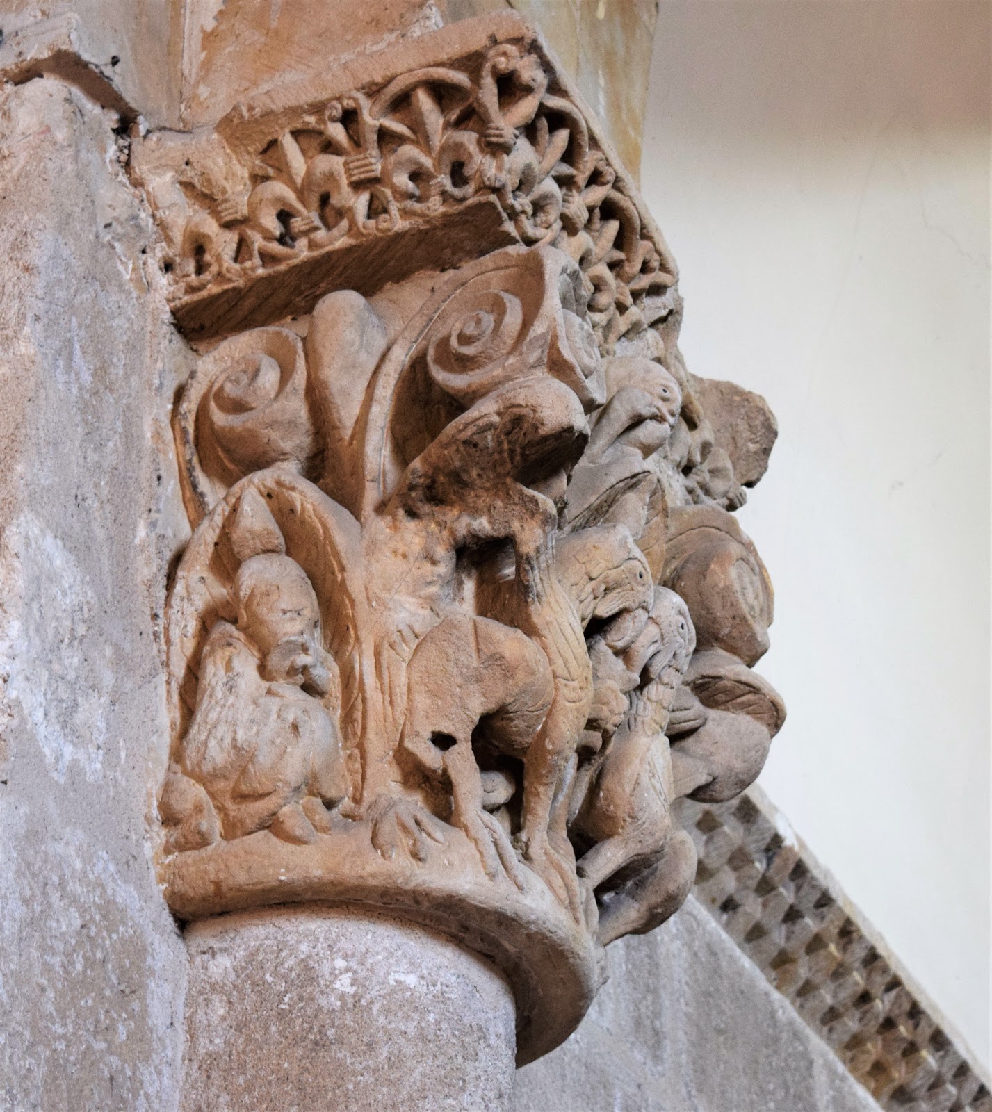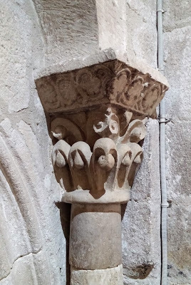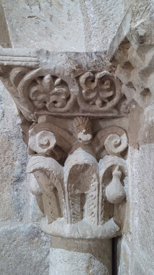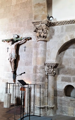 in procession during Holy Week. Here we're at the right side of the apse, and you can get a sense of one of the things that makes San Claudio's column capitals so special: the unique play of its Asturias-inspired blind arches puts most of them at eye-level! You hardly have to crane your neck at all to see the sculptural wonders.