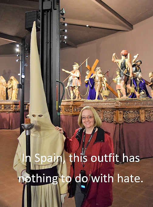 Holy Week Museum The idea behind the brotherhood costumes was that the members are marching in penitence. If people in the street could see who they were, it would be like bragging, literally taking a "holier than thou" attitude. Therefore, many of the brotherhoods use capes to cover recognizable clothing, and a hood that includes a cone to disguise the wearer's height. A certain radical group in the United States understood the advantages of anonymity as they carried out their acts of violence and hatred and appropriated the costume without permission. Holy Week celebrants all over Spain don't have to change their traditional costume because one notorious group in a foreign country uses it for evil. Even knowing all that, some of the costumes are hard to get used to.