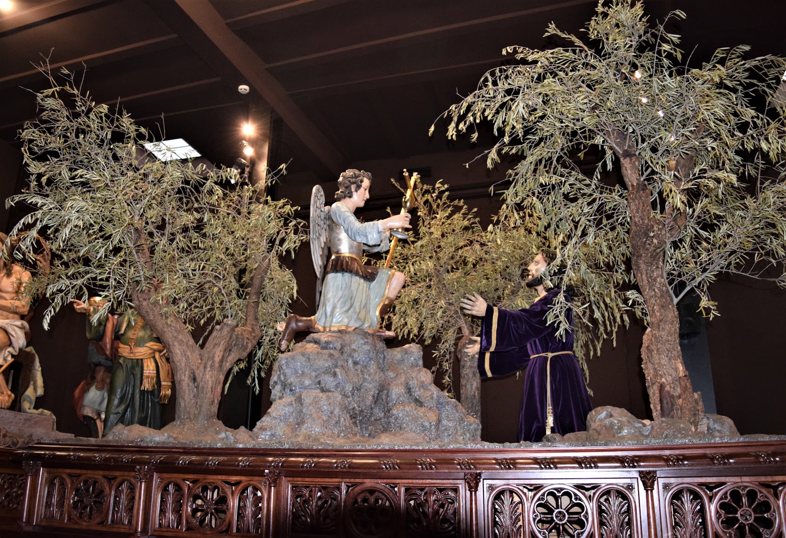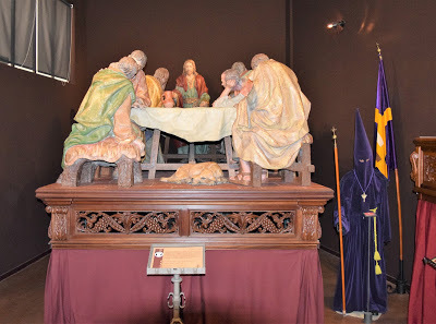 Holy Week Museum The floats, mobile works of art, can portray any and all Biblical scenes having to do with the Passion, and can have anywhere from a single half-sized statue to a crowded life-sized Crucifixion with thieves, Romans, and Mary Magdalene, to a Last Supper complete with table settings for thirteen. There is usually plenty of room on the sides of the float for candle holders and bouquets of fresh flowers. Some floats have evolved special features such as crucified Christs with articulated arms so that they can be taken from the cross and placed in a tomb. The floats must balance decorative exuberance with the width of the church door and the narrowest street on their processional routes as well as weight distribution.