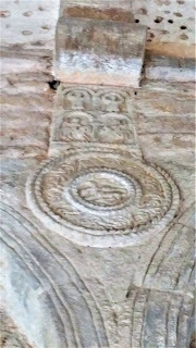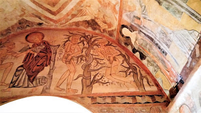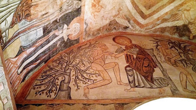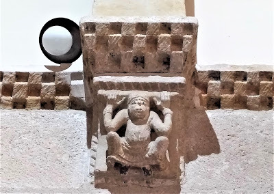 In the doorway, a frieze depicting circus performers, influenced by Roman wall art via Byzantium, is unique because it's the only non-religious artwork that has been found in a church of this period.
