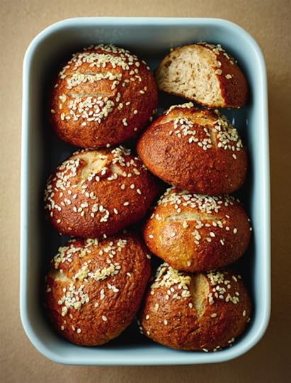 Brush the tops of the buns with the beaten egg and sprinkle the sesame seeds evenly over. Use a sharp knife to slash the tops of the buns. I like to either use three small slashes that are fairly deep or put a little cross in the centre. Bake in the oven for 20–25 minutes or until the buns sound hollow when tapped underneath and the tops have gone a medium to dark brown.