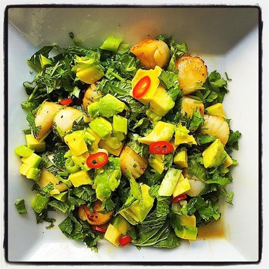 Pan fry the scallops for about 1.5 mins per side, depending on thickness. Chop up 1 bunch of mint and 1/2 bunch of coriander and 1/2 an avocado.