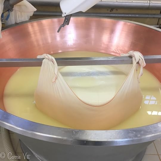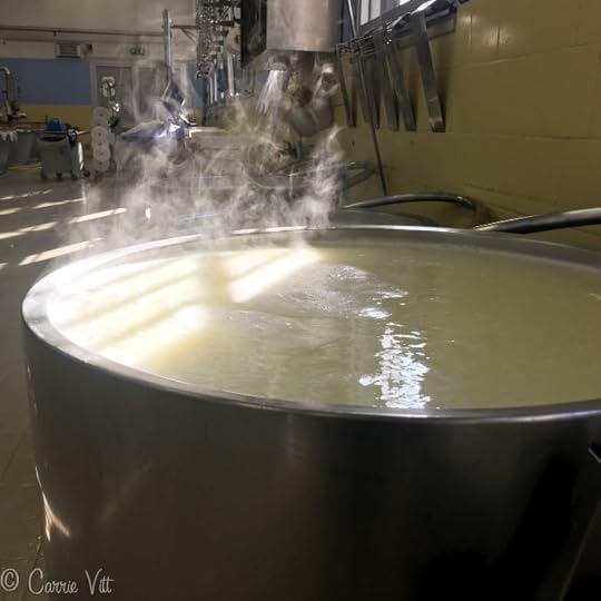 The raw, grass-fed milk is brought fresh into the factory each morning. They gently heat the milk, to separate the curds from the whey.