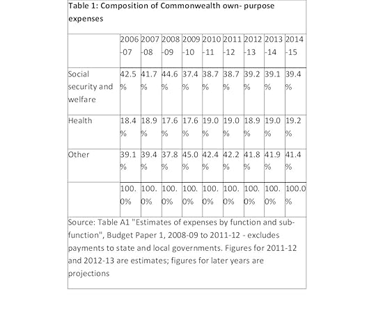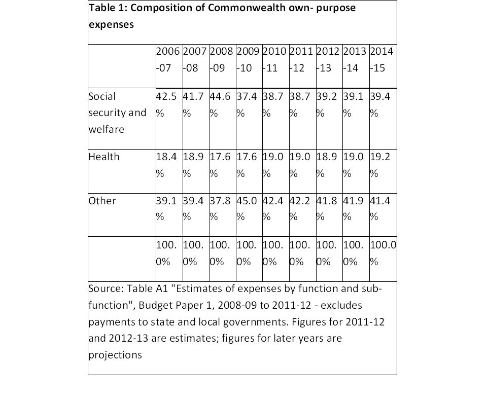 The way welfare transfers have been squeezing other areas of public expenditure is evident from an examination of the composition of recent budgets, presented in Table 1. This table shows a broad breakdown of Commonwealth outlays, separately identifying social security and welfare, and health, leaving a residual "other" category. This "other" category includes functions such as defence, education, housing and transport – a whole range of public goods provided by or funded by the Commonwealth.