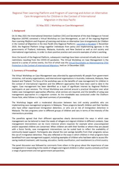 The latest event in the Platform was a virtual workshop held on 31 May 2021. The session focused on case management approaches using examples from two civil society groups in Malaysia to begin the discussion. Participants discussed the benefits of using case management approaches in the context of alternatives to detention, and shared some challenges they have faced in their implementation.