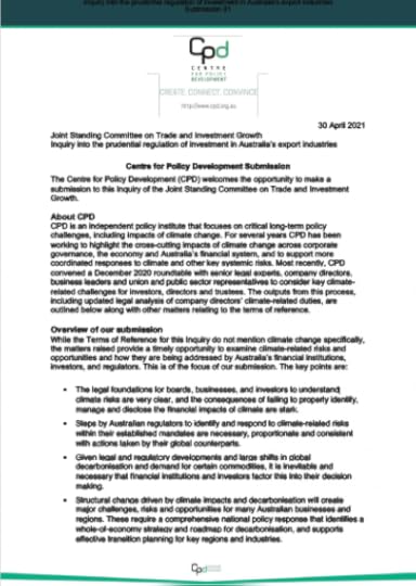 On Wednesday 28 July 2021, CPD’s CEO Travers McLeod and Sustainable Economy Program Director Toby Phillips appeared at the inquiry into the prudential regulation of investment in Australia’s export industries. Travers and Toby drew upon CPD’s work on directors’ duties and climate change and the Climate & Recovery Initiative to highlight that structural change driven by climate impacts and decarbonisation will create major challenges, risks and opportunities for many Australian businesses and regions. They also highlighted that risks from a changing climate and changing global demand for carbon-intensive goods are material to the interests of many companies and investors, who have clear duties to consider the financial impacts of climate change.