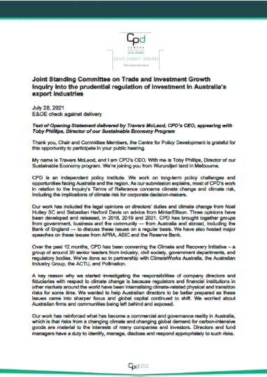 Web page for the inquiry into the prudential regulation of investment in Australia’s export industries Full video of CPD before the joint standing committee Transcript of the inquiryThe Climate & Recovery InitiativeDirectors’ Duties and Climate RisksThe post CPD appears at the inquiry into the prudential regulation of investment in Australia’s export industries appeared first on Centre for Policy Development.
