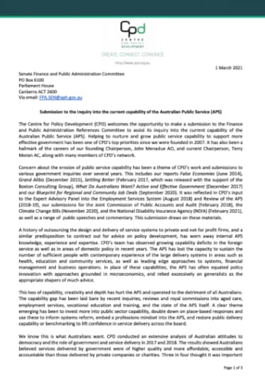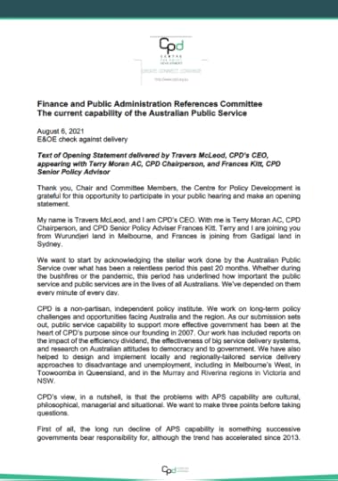On Friday 6 August 2021, CPD’s CEO Travers McLeod, CPD Chairperson Terry Moran AC and Senior Policy Advisor Frances Kitt appeared at the Senate Finance and Public Administration Committee’s inquiry into the current capability of the Australian Public Service. Travers, Terry and Frances highlighted the cultural, philosophical, managerial and situational problems with current APS capability. They drew upon CPD’s extensive work in public service capability, including the impact of the efficiency dividend, the effectiveness of big service delivery systems, research on Australian attitudes to democracy and to government, and place-based approaches to service delivery.