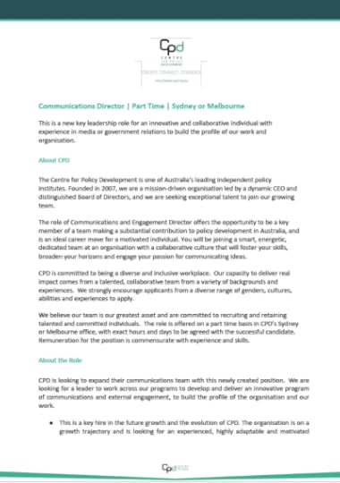 The post CPD is hiring a Communications Director appeared first on Centre for Policy Development.