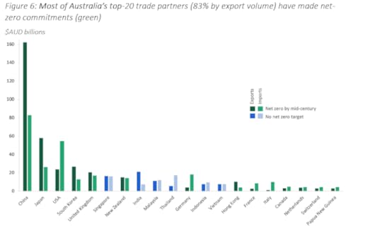 The numbers are stark. Looking at Australia’s top 20 trade partners, over 80 per cent of our exports are to countries that have pledged net-zero emissions by the middle of the century (China, South Korea, the UK, the EU, and several more). And Australia’s export mix is highly concentrated in carbon-intensive commodities: 70 per cent of what we sell to those countries is fossil fuels, minerals or metals.