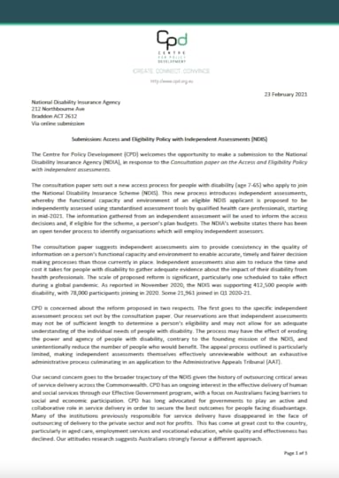 In late February, CPD made a submission to the National Disability Insurance Agency in regards to the Access and Eligibility Policy with Independent Assessments. Our CEO Travers McLeod and Chair Terry Moran outlined two key concerns with the reforms proposed. The first related to the specific independent assessment process set out by the consultation paper. The second concern spoke to the broader trajectory of the NDIS given the history of outsourcing vital areas of service delivery across the Commonwealth. You can read the full submission below.