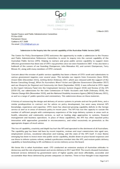 In early March, CPD also made a submission to the parliamentary Inquiry into the current capability of the Australian Public Service (APS). Our submission stated that “the starting point for renewing Australian democracy after COVID-19 is to reinvest in the creativity of our public services and ensure they are enriched by direct experience of the services Australians expect government to provide”. You can read the full submission below.
